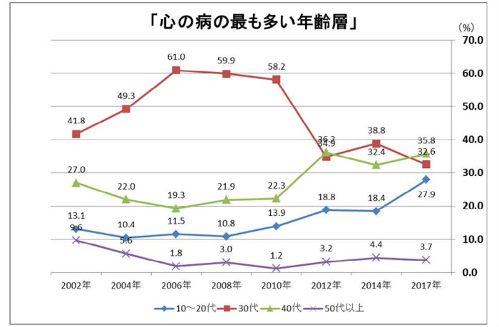 このテーマを長期間リサーチしている日本生産性本部「メンタルヘルス研究所」が2017年に行った「メンタルヘルスの取り組み」に関する企業アンケートの結果を見ると、「心の病」の年代別割合は、40代、30代が3割を上回って最も多くなっています。