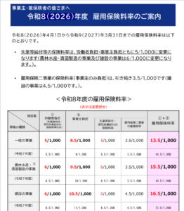 令和8年度 雇用保険料率変更のお知らせ(給与計算に注意!)新着!!